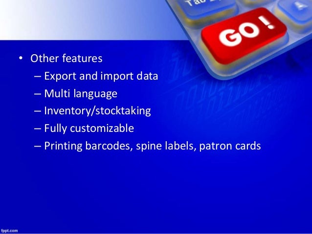 12. 12. • Other features – Export and import data – Multi language – Inventory/stocktaking – Fully customizable – Printing barcodes, spine labels, patron cards