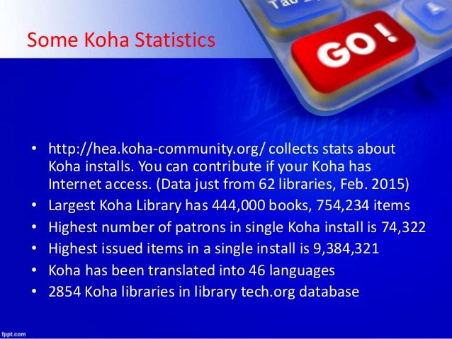 13. 13. Some Koha Statistics • http://hea.koha-community.org/ collects stats about Koha installs. You can contribute if your Koha has Internet access. (Data just from 62 libraries, Feb. 2015) • Largest Koha Library has 444,000 books, 754,234 items • Highest number of patrons in single Koha install is 74,322 • Highest issued items in a single install is 9,384,321 • Koha has been translated into 46 languages • 2854 Koha libraries in library tech.org database