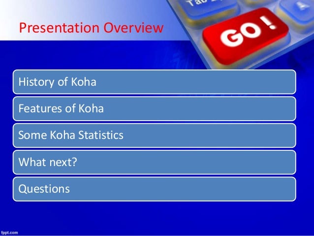 2. 2. Presentation Overview History of Koha Features of Koha Some Koha Statistics What next? Questions