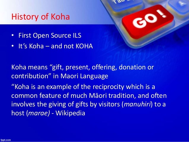 3. 3. History of Koha • First Open Source ILS • It’s Koha – and not KOHA Koha means “gift, present, offering, donation or contribution” in Maori Language “Koha is an example of the reciprocity which is a common feature of much Māori tradition, and often involves the giving of gifts by visitors (manuhiri) to a host (marae) - Wikipedia
