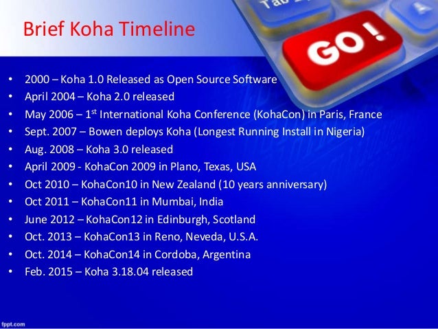 5. 5. Brief Koha Timeline • 2000 – Koha 1.0 Released as Open Source Software • April 2004 – Koha 2.0 released • May 2006 – 1st International Koha Conference (KohaCon) in Paris, France • Sept. 2007 – Bowen deploys Koha (Longest Running Install in Nigeria) • Aug. 2008 – Koha 3.0 released • April 2009 - KohaCon 2009 in Plano, Texas, USA • Oct 2010 – KohaCon10 in New Zealand (10 years anniversary) • Oct 2011 – KohaCon11 in Mumbai, India • June 2012 – KohaCon12 in Edinburgh, Scotland • Oct. 2013 – KohaCon13 in Reno, Neveda, U.S.A. • Oct. 2014 – KohaCon14 in Cordoba, Argentina • Feb. 2015 – Koha 3.18.04 released