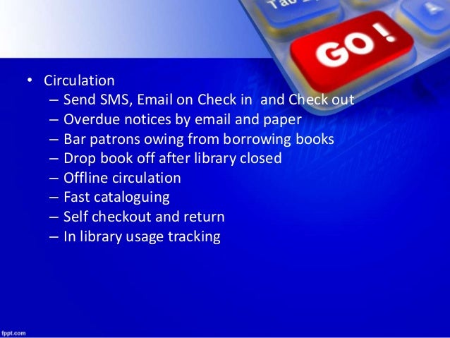 7. 7. • Circulation – Send SMS, Email on Check in and Check out – Overdue notices by email and paper – Bar patrons owing from borrowing books – Drop book off after library closed – Offline circulation – Fast cataloguing – Self checkout and return – In library usage tracking