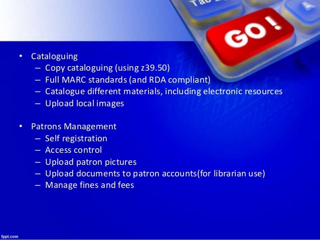 8. 8. • Cataloguing – Copy cataloguing (using z39.50) – Full MARC standards (and RDA compliant) – Catalogue different materials, including electronic resources – Upload local images • Patrons Management – Self registration – Access control – Upload patron pictures – Upload documents to patron accounts(for librarian use) – Manage fines and fees