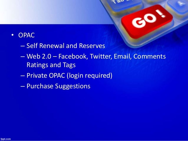 9. 9. • OPAC – Self Renewal and Reserves – Web 2.0 – Facebook, Twitter, Email, Comments Ratings and Tags – Private OPAC (login required) – Purchase Suggestions