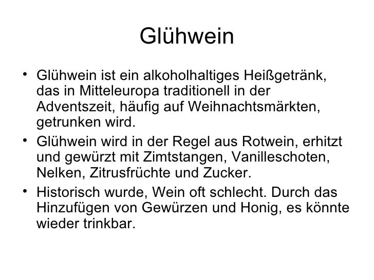 16. 16. Glühwein <ul><li>Glühwein ist ein alkoholhaltiges Heißgetränk, das in Mitteleuropa traditionell in der Adventszeit, häufig auf Weihnachtsmärkten, getrunken wird. </li></ul><ul><li>Glühwein wird in der Regel aus Rotwein, erhitzt und gewürzt mit Zimtstangen, Vanilleschoten, Nelken, Zitrusfrüchte und Zucker. </li></ul><ul><li>Historisch wurde, Wein oft schlecht. Durch das Hinzufügen von Gewürzen und Honig, es könnte wieder trinkbar. </li></ul>