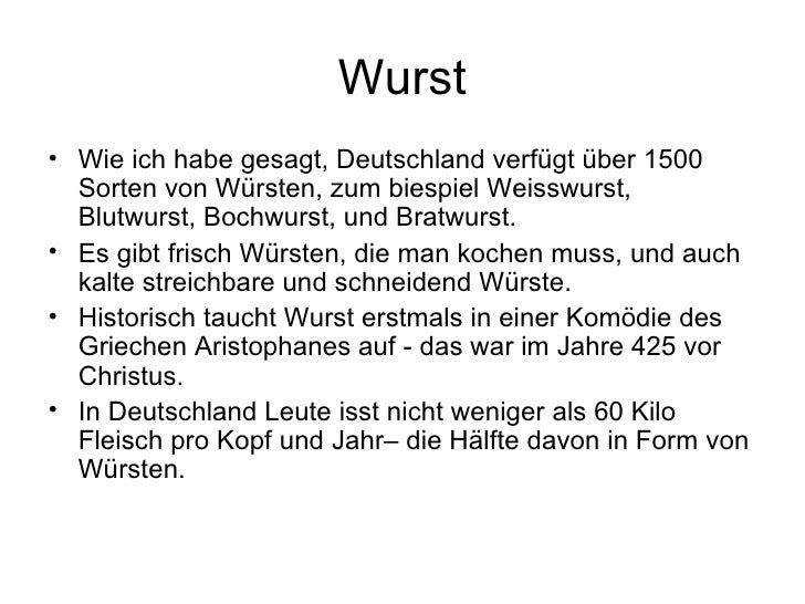 4. 4. Wurst <ul><li>Wie ich habe gesagt, Deutschland verfügt über 1500 Sorten von Würsten, zum biespiel Weisswurst, Blutwurst, Bochwurst, und Bratwurst. </li></ul><ul><li>Es gibt frisch Würsten, die man kochen muss, und auch kalte streichbare und schneidend Würste. </li></ul><ul><li>Historisch taucht Wurst erstmals in einer Komödie des Griechen Aristophanes auf - das war im Jahre 425 vor Christus. </li></ul><ul><li>In Deutschland Leute isst nicht weniger als 60 Kilo Fleisch pro Kopf und Jahr– die Hälfte davon in Form von Würsten. </li></ul>