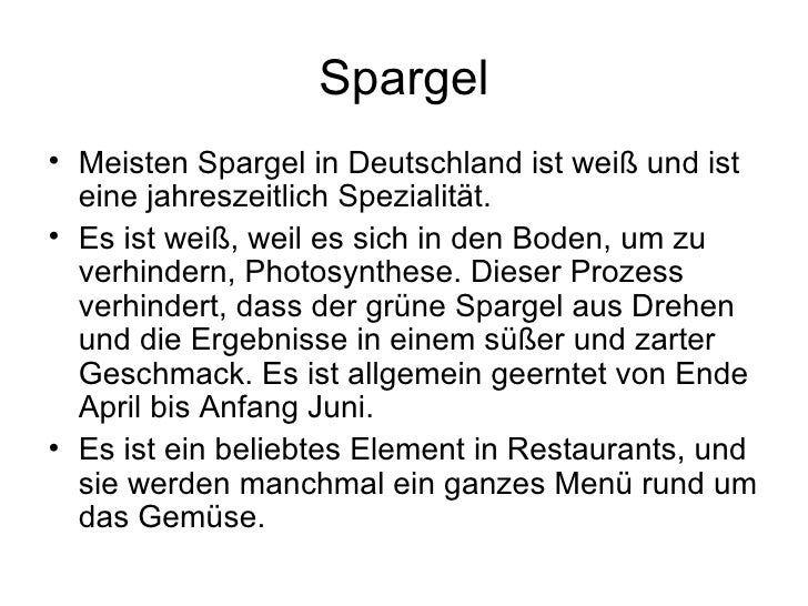 7. 7. Spargel <ul><li>Meisten Spargel in Deutschland ist weiß und ist eine jahreszeitlich Spezialität. </li></ul><ul><li>Es ist weiß, weil es sich in den Boden, um zu verhindern, Photosynthese. Dieser Prozess verhindert, dass der grüne Spargel aus Drehen und die Ergebnisse in einem süßer und zarter Geschmack. Es ist allgemein geerntet von Ende April bis Anfang Juni. </li></ul><ul><li>Es ist ein beliebtes Element in Restaurants, und sie werden manchmal ein ganzes Menü rund um das Gemüse. </li></ul>