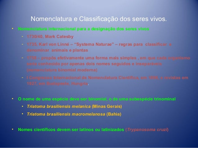10. 10. Nomenclatura e Classificação dos seres vivos. • Nomenclatura internacional para a designação dos seres vivos ­ 1730/40, Mark Catesby ­ 1735, Karl von Linné – “Systema Naturae” – regras para classificar e denominar animais e plantas ­ 1758 – propôs efetivamente uma forma mais simples , em que cada organismo seria conhecido por apenas dois nomes seguidos e inseparáveis (nomenclatura binomial moderna) ­ I Congresso Internacional de Nomenclatura Científica, em 1898, e revistas em 1927, em Budapeste, Hungria. • O nome de uma espécie deve ser binomial, o de uma subespécie trinominal • Triatoma brasiliensis melanica (Minas Gerais) • Triatoma brasiliensis macromelanosa (Bahia) • Nomes científicos devem ser latinos ou latinizados (Trypanosoma cruzi)
