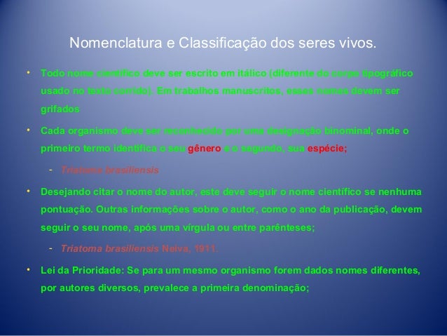 11. 11. Nomenclatura e Classificação dos seres vivos. • Todo nome científico deve ser escrito em itálico (diferente do corpo tipográfico usado no texto corrido). Em trabalhos manuscritos, esses nomes devem ser grifados • Cada organismo deve ser reconhecido por uma designação binominal, onde o primeiro termo identifica o seu gênero e o segundo, sua espécie; ­ Triatoma brasiliensis • Desejando citar o nome do autor, este deve seguir o nome científico se nenhuma pontuação. Outras informações sobre o autor, como o ano da publicação, devem seguir o seu nome, após uma vírgula ou entre parênteses; ­ Triatoma brasiliensis Neiva, 1911. • Lei da Prioridade: Se para um mesmo organismo forem dados nomes diferentes, por autores diversos, prevalece a primeira denominação;