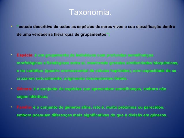12. 12. Taxonomia. • “estudo descritivo de todas as espécies de seres vivos e sua classificação dentro de uma verdadeira hierarquia de grupamentos”; • Espécie: é um grupamento de indivíduos com profundas semelhanças morfológicas e fisiológicas entre si, mostrando grandes similaridades bioquímicas, e no cariótipo (quadro cromossomial de células haplóides), com capacidade de se cruzarem naturalmente, originando descendentes férteis. • Gênero: é o conjunto de espécies que apresentam semelhanças, embora não sejam idênticas; • Família: é o conjunto de gêneros afins, isto é, muito próximos ou parecidos, embora possuam diferenças mais significativas do que a divisão em gêneros.