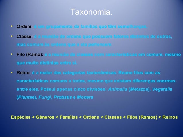 13. 13. Taxonomia. • Ordem: é um grupamento de famílias que têm semelhanças. • Classe: é a reunião de ordens que possuem fatores distintos de outras, mas comum às ordens que a ela pertencem • Filo (Ramo): é a reunião de classes com características em comum, mesmo que muito distintas entre si. • Reino: é a maior das categorias taxionômicas. Reune filos com as características comuns a todos, mesmo que existam diferenças enormes entre eles. Possui apenas cinco divisões: Animalia (Metazoa), Vegetalia (Plantae), Fungi, Protistis e Monera Espécies < Gêneros < Famílias < Ordens < Classes < Filos (Ramos) < Reinos