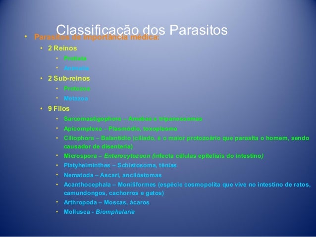 14. 14. Classificação dos Parasitos • Parasitos de importância médica: • 2 Reinos • Protista • Animalia • 2 Sub-reinos • Protozoa • Metazoa • 9 Filos • Sarcomastigophora – Amebas e tripanossomas • Apicomplexa – Plasmódio, toxoplasma • Ciliophora – Balantídio (ciliado, é o maior protozoário que parasita o homem, sendo causador de disenteria) • Microspora – Enterocytozoon (infecta células epiteliais do intestino) • Platyhelminthes – Schistosoma, tênias • Nematoda – Ascari, ancilóstomas • Acanthocephala – Moniliformes (espécie cosmopolita que vive no intestino de ratos, camundongos, cachorros e gatos) • Arthropoda – Moscas, ácaros • Mollusca - Biomphalaria
