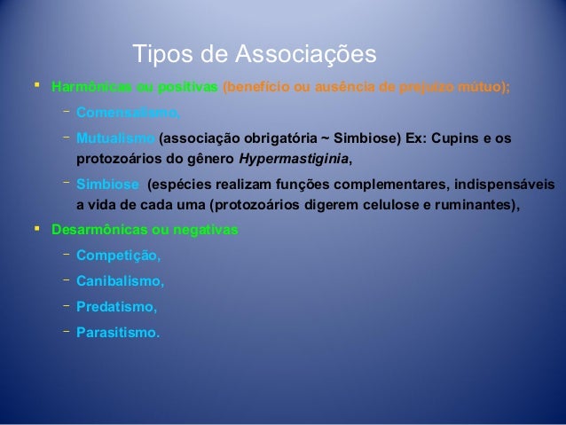 15. 15. Tipos de Associações  Harmônicas ou positivas (benefício ou ausência de prejuízo mútuo); ­ Comensalismo, ­ Mutualismo (associação obrigatória ~ Simbiose) Ex: Cupins e os protozoários do gênero Hypermastiginia, ­ Simbiose (espécies realizam funções complementares, indispensáveis a vida de cada uma (protozoários digerem celulose e ruminantes),  Desarmônicas ou negativas ­ Competição, ­ Canibalismo, ­ Predatismo, ­ Parasitismo.