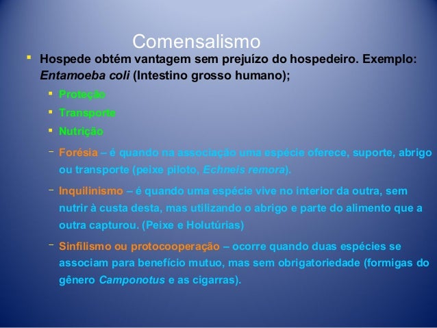 16. 16. Comensalismo  Hospede obtém vantagem sem prejuízo do hospedeiro. Exemplo: Entamoeba coli (Intestino grosso humano);  Proteção  Transporte  Nutrição ­ Forésia – é quando na associação uma espécie oferece, suporte, abrigo ou transporte (peixe piloto, Echneis remora). ­ Inquilinismo – é quando uma espécie vive no interior da outra, sem nutrir à custa desta, mas utilizando o abrigo e parte do alimento que a outra capturou. (Peixe e Holutúrias) ­ Sinfilismo ou protocooperação – ocorre quando duas espécies se associam para benefício mutuo, mas sem obrigatoriedade (formigas do gênero Camponotus e as cigarras).