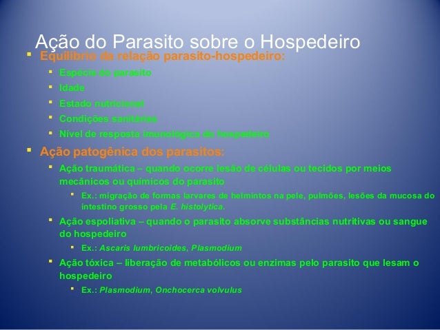 17. 17. Ação do Parasito sobre o Hospedeiro  Equilíbrio da relação parasito-hospedeiro:  Espécie do parasito  Idade  Estado nutricional  Condições sanitárias  Nível de resposta imunológica do hospedeiro  Ação patogênica dos parasitos:  Ação traumática – quando ocorre lesão de células ou tecidos por meios mecânicos ou químicos do parasito  Ex.: migração de formas larvares de helmintos na pele, pulmões, lesões da mucosa do intestino grosso pela E. histolytica.  Ação espoliativa – quando o parasito absorve substâncias nutritivas ou sangue do hospedeiro  Ex.: Ascaris lumbricoides, Plasmodium  Ação tóxica – liberação de metabólicos ou enzimas pelo parasito que lesam o hospedeiro  Ex.: Plasmodium, Onchocerca volvulus