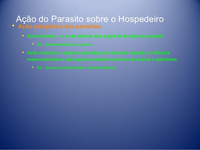 18. 18. Ação do Parasito sobre o Hospedeiro  Ação patogênica dos parasitos:  Ação Irritativa – a lesão através dos órgão de fixação do parasito  Ex.: Giardia lamblia, Ascasris.  Ação mecanica– quando a presença do parasito impede ou dificulta mecanicamente a absroção de alimento ou fluxo de ductos e glândulas.  Ex.: Ascaris lumbricoides, Giardia lamblia