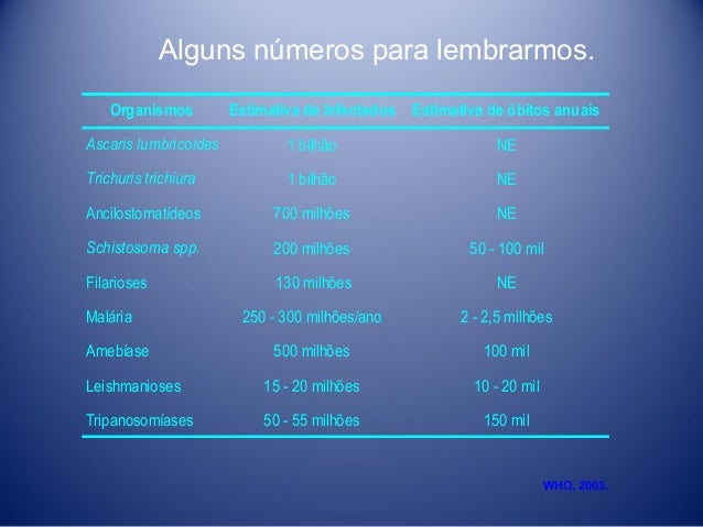 19. 19. Alguns números para lembrarmos. Organismos Estimativa de Infectados Estimativa de óbitos anuais Ascaris lumbricoides 1 bilhão NE Trichuris trichiura 1 bilhão NE Ancilostomatídeos 700 milhões NE Schistosoma spp. 200 milhões 50 - 100 mil Filarioses 130 milhões NE 250 - 300 milhões/ano 2 - 2,5 milhões 500 milhões 100 mil Leishmanioses 15 - 20 milhões 10 - 20 mil Tripanosomíases 50 - 55 milhões 150 mil Malária Amebíase WHO, 2003.