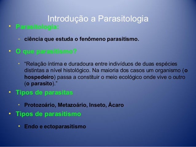 2. 2. Introdução a Parasitologia • Parasitologia: ­ ciência que estuda o fenômeno parasitismo. • O que parasitismo? • “Relação íntima e duradoura entre indivíduos de duas espécies distintas a nível histológico. Na maioria dos casos um organismo (o hospedeiro) passa a constituir o meio ecológico onde vive o outro (o parasito).” • Tipos de parasitas • Protozoário, Metazoário, Inseto, Ácaro • Tipos de parasitismo • Endo e ectoparasitismo