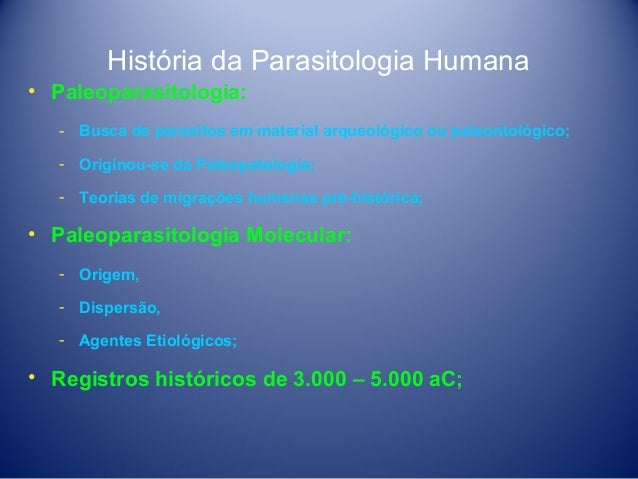 3. 3. História da Parasitologia Humana • Paleoparasitologia: ­ Busca de parasitos em material arqueológico ou paleontológico; ­ Originou-se da Paleopatologia; ­ Teorias de migrações humanas pré-histórica; • Paleoparasitologia Molecular: ­ Origem, ­ Dispersão, ­ Agentes Etiológicos; • Registros históricos de 3.000 – 5.000 aC;