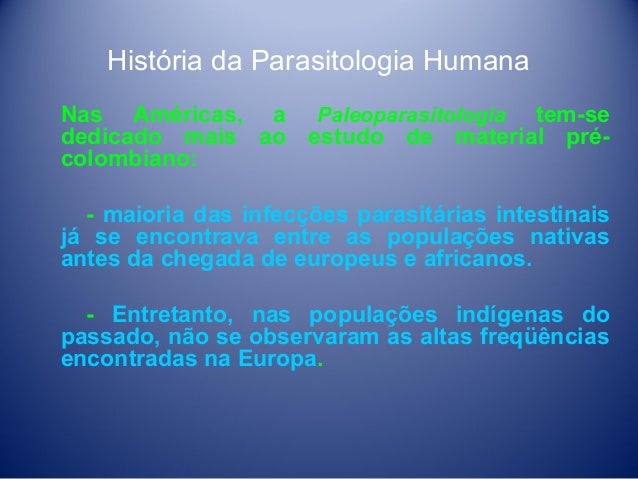 4. 4. História da Parasitologia Humana Nas Américas, a Paleoparasitologia tem-se dedicado mais ao estudo de material précolombiano: - maioria das infecções parasitárias intestinais já se encontrava entre as populações nativas antes da chegada de europeus e africanos. - Entretanto, nas populações indígenas do passado, não se observaram as altas freqüências encontradas na Europa.