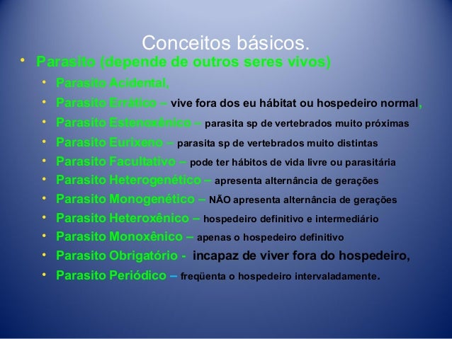5. 5. Conceitos básicos. • Parasito (depende de outros seres vivos) • Parasito Acidental, • Parasito Errático – vive fora dos eu hábitat ou hospedeiro normal, • Parasito Estenoxênico – parasita sp de vertebrados muito próximas • Parasito Eurixeno – parasita sp de vertebrados muito distintas • Parasito Facultativo – pode ter hábitos de vida livre ou parasitária • Parasito Heterogenético – apresenta alternância de gerações • Parasito Monogenético – NÃO apresenta alternância de gerações • Parasito Heteroxênico – hospedeiro definitivo e intermediário • Parasito Monoxênico – apenas o hospedeiro definitivo • Parasito Obrigatório - incapaz de viver fora do hospedeiro, • Parasito Periódico – freqüenta o hospedeiro intervaladamente.