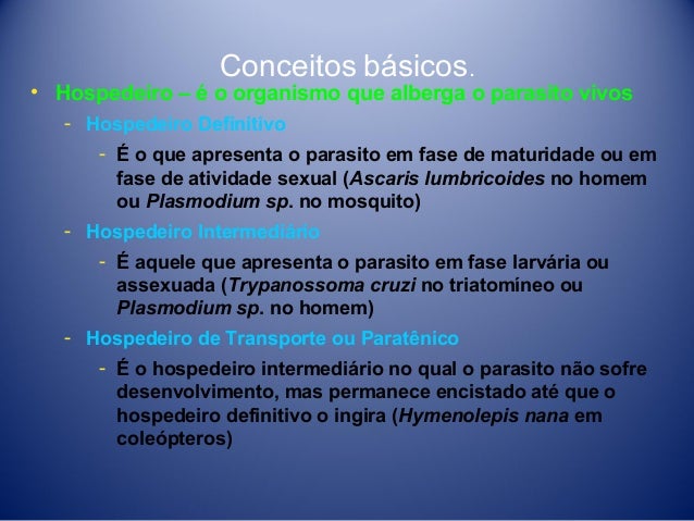 6. 6. Conceitos básicos. • Hospedeiro – é o organismo que alberga o parasito vivos ­ Hospedeiro Definitivo ­ É o que apresenta o parasito em fase de maturidade ou em fase de atividade sexual (Ascaris lumbricoides no homem ou Plasmodium sp. no mosquito) ­ Hospedeiro Intermediário ­ É aquele que apresenta o parasito em fase larvária ou assexuada (Trypanossoma cruzi no triatomíneo ou Plasmodium sp. no homem) ­ Hospedeiro de Transporte ou Paratênico ­ É o hospedeiro intermediário no qual o parasito não sofre desenvolvimento, mas permanece encistado até que o hospedeiro definitivo o ingira (Hymenolepis nana em coleópteros)