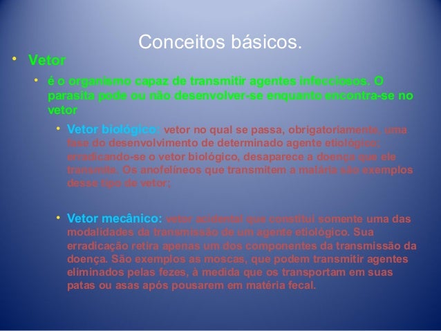 7. 7. • Vetor Conceitos básicos. • é o organismo capaz de transmitir agentes infecciosos. O parasita pode ou não desenvolver-se enquanto encontra-se no vetor • Vetor biológico: vetor no qual se passa, obrigatoriamente, uma fase do desenvolvimento de determinado agente etiológico; erradicando-se o vetor biológico, desaparece a doença que ele transmite. Os anofelíneos que transmitem a malária são exemplos desse tipo de vetor; • Vetor mecânico: vetor acidental que constitui somente uma das modalidades da transmissão de um agente etiológico. Sua erradicação retira apenas um dos componentes da transmissão da doença. São exemplos as moscas, que podem transmitir agentes eliminados pelas fezes, à medida que os transportam em suas patas ou asas após pousarem em matéria fecal.