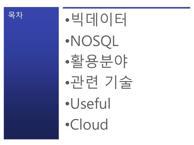 2. 2. 목차 •빅데이터 •NOSQL •활용분야 •관련 기술 •Useful •Cloud