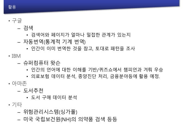 5. 5. 활용 • 구글 – 검색 • 검색어와 페이지가 얼마나 밀접한 관계가 있는지 – 자동번역(통계적 기계 번역) • 인간이 이미 번역한 것을 참고, 토대로 패턴을 조사 • IBM – 슈퍼컴퓨터 왓슨 • 인간의 언어에 대한 이해를 기반/퀴즈쇼에서 챔피언과 겨뤄 우승 • 의료보험 데이터 분석, 종양진단 처리, 금융분야등에 활용 예정. • 아마존 – 도서추천 • 도서 구매 데이터 분석 • 기타 – 위험관리시스템(싱가폴) – 미국 국립보건원(NH)의 의약품 검색 등등