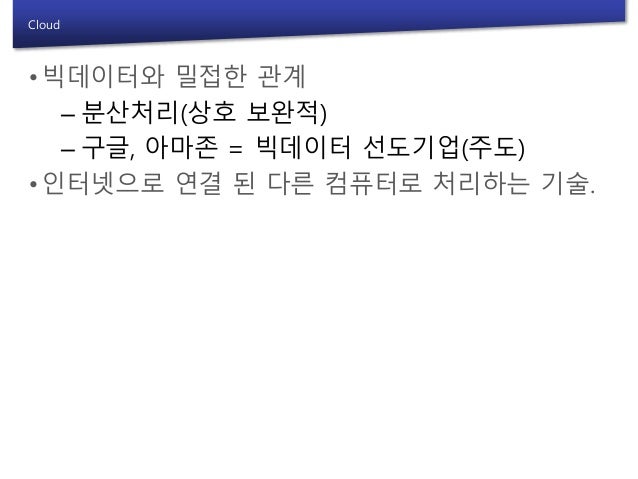 8. 8. Cloud •빅데이터와 밀접한 관계 – 분산처리(상호 보완적) – 구글, 아마존 = 빅데이터 선도기업(주도) •인터넷으로 연결 된 다른 컴퓨터로 처리하는 기술.