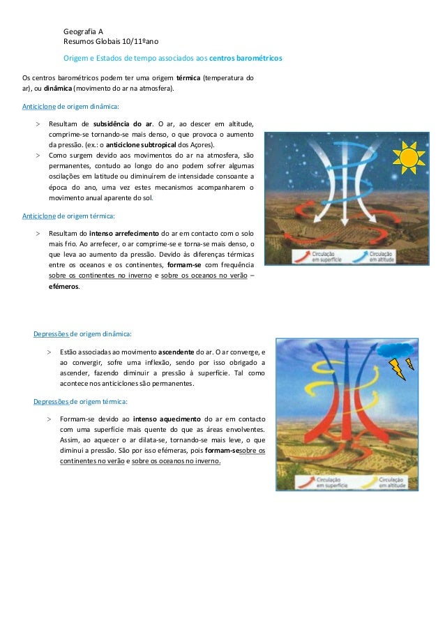 10. 10. Geografia AResumos Globais 10/11ºanoOrigem e Estados de tempo associados aos centros barométricosOs centros barométricos podem ter uma origem térmica (temperatura doar), ou dinâmica (movimento do ar na atmosfera).Anticiclone de origem dinâmica:> Resultam de subsidência do ar. O ar, ao descer em altitude,comprime-se tornando-se mais denso, o que provoca o aumentoda pressão. (ex.: o anticiclone subtropical dos Açores).> Como surgem devido aos movimentos do ar na atmosfera, sãopermanentes, contudo ao longo do ano podem sofrer algumasoscilações em latitude ou diminuírem de intensidade consoante aépoca do ano, uma vez estes mecanismos acompanharem omovimento anual aparente do sol.Anticiclone de origem térmica:> Resultam do intenso arrefecimento do ar em contacto com o solomais frio. Ao arrefecer, o ar comprime-se e torna-se mais denso, oque leva ao aumento da pressão. Devido às diferenças térmicasentre os oceanos e os continentes, formam-se com frequênciasobre os continentes no inverno e sobre os oceanos no verão –efémeros.Depressões de origem dinâmica:> Estão associadas ao movimento ascendente do ar. O ar converge, eao convergir, sofre uma inflexão, sendo por isso obrigado aascender, fazendo diminuir a pressão à superfície. Tal comoacontece nos anticiclones são permanentes.Depressões de origem térmica:> Formam-se devido ao intenso aquecimento do ar em contactocom uma superfície mais quente do que as áreas envolventes.Assim, ao aquecer o ar dilata-se, tornando-se mais leve, o quediminui a pressão. São por isso efémeras, pois formam-sesobre oscontinentes no verão e sobre os oceanos no inverno.