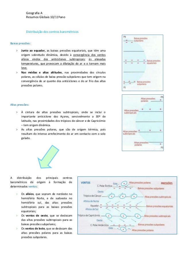 11. 11. Geografia AResumos Globais 10/11ºanoDistribuição dos centros barométricosBaixas pressões:> Junto ao equador, as baixas pressões equatoriais, que têm umaorigem sobretudo dinâmica, devido à convergência dos ventosalísios vindos dos anticiclones subtropicais; às elevadastemperaturas, que provocam a dilatação do ar e o tornam maisleve.> Nas médias e altas altitudes, nas proximidades dos círculospolares, as células de baixa pressão subpolares que tem origem naconvergência de ar quente dos anticiclones e do ar frio das altaspressões polares.Altas pressões:> À cintura de altas pressões subtropicais, onde se inclui oimportante anticiclone dos Açores, sensivelmente a 30º delatitude, nas proximidades dos trópicos de câncer e de Capricórnio– tem origem dinâmica.> As altas pressões polares, que são de origem térmica, poisresultam do intenso arrefecimento do ar em contacto com o sologelado.A distribuição dos principais centrosbarométricos dá origem à formação dedeterminados ventos:> Os alísios, que sopram de nordeste nohemisfério Norte, e de sudoeste nohemisfério sul, das altas pressõessubtropicais para as baixas pressõesequatoriais;> Os ventos de oeste, que se deslocamdas altas pressões subtropicais para asbaixas pressões subpolares;> Os ventos de leste, que se deslocam dasaltas pressões polares para as baixaspressões subpolares.