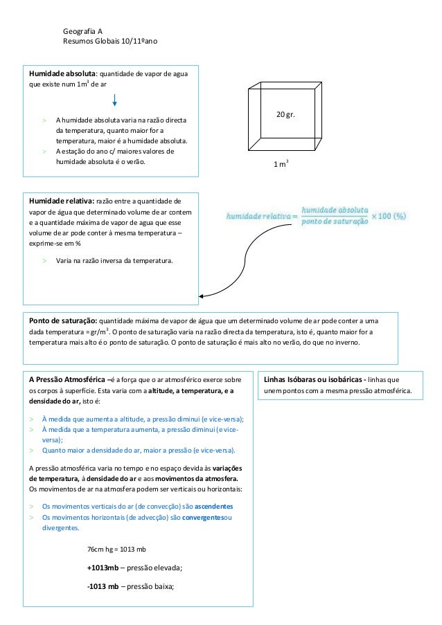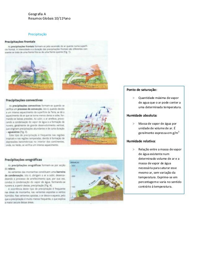 13. 13. Geografia AResumos Globais 10/11ºanoPrecipitaçãoPonto de saturação:> Quantidade máxima de vaporde agua que o ar pode conter auma determinada temperatura.Humidade absoluta:> Massa de vapor de água porunidade de volume de ar. Égeralmente expressa em g/m3Humidade relativa:> Relação entre a massa de vaporde água existente numdeterminado volume de ar e amassa de vapor de águanecessária para saturar essemesmo ar, sem variação datemperatura. Exprime-se empercentagem e varia no sentidocontrário à temperatura.
