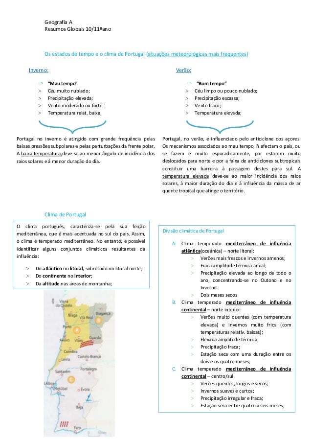 14. 14. Geografia AResumos Globais 10/11ºanoOs estados de tempo e o clima de Portugal (situações meteorológicas mais frequentes)Clima de Portugal,Inverno:“Mau tempo”> Céu muito nublado;> Precipitação elevada;> Vento moderado ou forte;> Temperatura relat. baixa;Portugal no inverno é atingido com grande frequência pelasbaixas pressões subpolares e pelas perturbações da frente polar.A baixa temperatura,deve-se ao menor ângulo de incidência dosraios solares e á menor duração do dia.Verão:“Bom tempo”> Céu limpo ou pouco nublado;> Precipitação escassa;> Vento fraco;> Temperatura elevada;Portugal, no verão, é influenciado pelo anticiclone dos açores.Os mecanismos associados ao mau tempo, ñ afectam o país, ouse fazem é muito esporadicamente, por estarem muitodeslocados para norte e por a faixa de anticiclones subtropicaisconstituir uma barreira à passagem destes para sul. Atemperatura elevada deve-se ao maior incidência dos raiossolares, à maior duração do dia e à influência da massa de arquente tropical que atinge o território.O clima português, caracteriza-se pela sua feiçãomediterrânea, que é mais acentuada no sul do país. Assim,o clima é temperado mediterrâneo. No entanto, é possívelidentificar alguns conjuntos climáticos resultantes dainfluência:> Do atlântico no litoral, sobretudo no litoral norte;> Do continente no interior;> Da altitude nas áreas de montanha;Divisão climática de PortugalA. Clima temperado mediterrâneo de influênciaatlântica(oceânica) – norte litoral:> Verões mais frescos e invernos amenos;> Fraca amplitude térmica anual;> Precipitação elevada ao longo de todo oano, concentrando-se no Outono e noInverno.> Dois meses secosB. Clima temperado mediterrâneo de influênciacontinental – norte interior:> Verões muito quentes (com temperaturaelevada) e invernos muito frios (comtemperaturas relativ. baixas);> Elevada amplitude térmica;> Precipitação fraca;> Estação seca com uma duração entre osdois e os quatro meses;C. Clima temperado mediterrâneo de influênciacontinental – centro/sul:> Verões quentes, longos e secos;> Invernos suaves e curtos;> Precipitação irregular e fraca;> Estação seca entre quatro a seis meses;