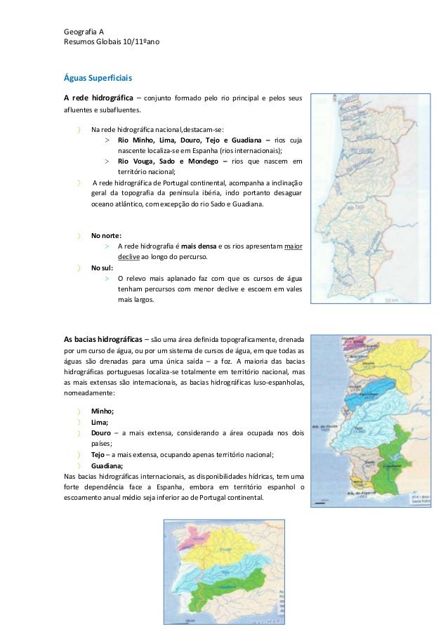 15. 15. Geografia AResumos Globais 10/11ºanoÁguas SuperficiaisA rede hidrográfica – conjunto formado pelo rio principal e pelos seusafluentes e subafluentes.Na rede hidrográfica nacional,destacam-se:> Rio Minho, Lima, Douro, Tejo e Guadiana – rios cujanascente localiza-se em Espanha (rios internacionais);> Rio Vouga, Sado e Mondego – rios que nascem emterritório nacional;A rede hidrográfica de Portugal continental, acompanha a inclinaçãogeral da topografia da península ibéria, indo portanto desaguaroceano atlântico, com excepção do rio Sado e Guadiana.No norte:> A rede hidrografia é mais densa e os rios apresentam maiordeclive ao longo do percurso.No sul:> O relevo mais aplanado faz com que os cursos de águatenham percursos com menor declive e escoem em valesmais largos.As bacias hidrográficas – são uma área definida topograficamente, drenadapor um curso de água, ou por um sistema de cursos de água, em que todas aságuas são drenadas para uma única saída – a foz. A maioria das baciashidrográficas portuguesas localiza-se totalmente em território nacional, masas mais extensas são internacionais, as bacias hidrográficas luso-espanholas,nomeadamente:Minho;Lima;Douro – a mais extensa, considerando a área ocupada nos doispaíses;Tejo – a mais extensa, ocupando apenas território nacional;Guadiana;Nas bacias hidrográficas internacionais, as disponibilidades hídricas, tem umaforte dependência face a Espanha, embora em território espanhol oescoamento anual médio seja inferior ao de Portugal continental.