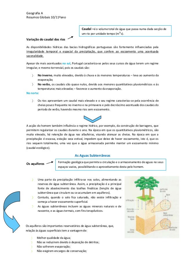 16. 16. Geografia AResumos Globais 10/11ºanoVariação do caudal dos riosAs disponibilidades hídricas das bacias hidrográficas portuguesas são fortemente influenciadas pelairregularidade temporal e espacial da precipitação, que confere ao escoamento uma acentuadasazonalidade.Apesar de mais acentuados no sul, Portugal caracteriza-se pelos seus cursos de água terem um regimeirregular, e mesmo torrencial, pois os caudais são:No inverno, muito elevados, devido à chuva e às menores temperaturas – leva ao aumento daevaporação;No verão, os caudais são quase nulos, devido aos menores quantitativos pluviométricos e àstemperaturas mais elevadas – favorece o aumento da evaporação.No norte:Os rios apresentam um caudal mais elevado e o seu regime caracteriza-se pela ocorrência decheias pouco frequente no inverno e na primavera e pelo decréscimo acentuado dos caudais doperíodo de verão, havendo mesmo rios sem escoamento.A acção do homem também influência o regime hídrico, por exemplo, da construção de barragens, quepermitem regularizar os caudais durante o ano. Na época em que os quantitativos pluviométricos, sãomuito elevado, há retenção de água nas albufeiras, visando atenuar as cheias. Na época em que aprecipitação é escassa, estação seca estival, impedem que deixe de haver escoamento, isto é, que osrios sequem totalmente, uma vez que a água armazenada permite manter um escoamento mínimo(caudal ecológico).As Aguas SubterrâneasOs aquíferosUma parte da precipitação infiltra-se nos solos, alimentando asreservas de água subterrânea. Assim, a precipitação é a principalfonte de abastecimento das toalhas freáticas (lençóis de águasubterrânea que circulam ou se acumulam em aquíferos).Contudo, quando o solo fica saturado, não existe infiltração ecomeça a haver escoamento superficial.As águas subterrâneas incluem as águas minerais naturais e denascente, e as águas termais, com fins terapêuticos.Caudal –é o volume total de água que passa numa dada secção deum rio por unidade tempo (m3/s).Formação geológica que permite a circulação e o armazenamento de aguas no seusespaços vazios, possibilitando o aproveitamento desta pelo homem.Os aquíferos são importantes reservatórios de água subterrânea, que,relação às águas superficiais tem a vantagem de:Melhor qualidade da água;Não se reduzirem devido à deposição de detritos;Não sofrerem evaporação;Não exigirem encargos de conservação;