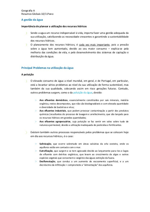 17. 17. Geografia AResumos Globais 10/11ºanoA gestão da águaImportância de planear a utilização dos recursos hídricosSendo a agua um recurso indispensável á vida, importa fazer uma gestão adequada dasua utilização, satisfazendo as necessidade crescentes e garantindo a sustentabilidadedos recursos hídricos.O planeamento dos recursos hídricos, é cada vez mais importante, pois a pressãosobre a água tem aumentado, devido ao seu maior consumo – explica-se pelamelhoria das condições de vida, e pelo desenvolvimento dos sistemas de captação edistribuição da água.Principal Problemas na utilização da águaA poluiçãoO elevado consumo de água a nível mundial, em geral, e de Portugal, em particular,está a levantar sérios problemas ao nível da sua utilização de forma sustentável, mastambém da sua qualidade, colocando assim em risco gerações futuras. Contudo,outros problemas surgem, como o da poluição da água, devido:> Aos efluentes domésticos, essencialmente constituídos por sais minerais, matériaorgânica, restos decompostos, que não são biodegradáveis e com elevada quantidadee diversidade de bactérias e vírus;> Aos efluentes industriais, que podem provocar contaminação a partir dos produtosquímicos (resultantes do processo de lavagem e arrefecimento, que são lançado paraos recursos hídricos em grandes quantidades;> Aos efluentes agropecuários, cuja poluição se faz sentir em solos sobre tudo denatureza permeável, devido a utilização inadequada de pesticidas e fertilizantes.Existem também outros processos responsáveis pelos problemas que se colocam hojeem dia aos recursos hídricos, é o caso:> Salinização, que ocorre sobretudo em áreas calcárias da orla costeira, onde osaquíferos estão em contacto com o mar.> Eutrofização, que surgem e se tem agravado devido ao lançamento para rios e lagosde efluente com detritos orgânicos, que levam ao crescimento de algas e outrasespécies vegetais que consomem o oxigénio das águas extinção da fauna.> Desflorestação, que conduz a um aumento do escoamento superficial, e a umdecréscimo da infiltração = compromete a “alimentação” dos aquíferos.