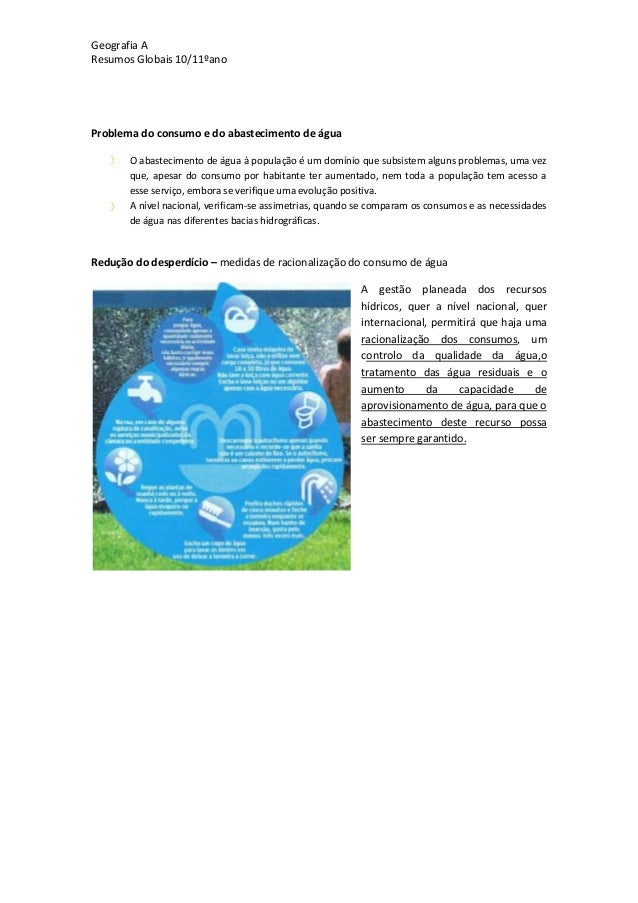 18. 18. Geografia AResumos Globais 10/11ºanoProblema do consumo e do abastecimento de águaO abastecimento de água à população é um domínio que subsistem alguns problemas, uma vezque, apesar do consumo por habitante ter aumentado, nem toda a população tem acesso aesse serviço, embora se verifique uma evolução positiva.A nível nacional, verificam-se assimetrias, quando se comparam os consumos e as necessidadesde água nas diferentes bacias hidrográficas.Redução do desperdício – medidas de racionalização do consumo de águaA gestão planeada dos recursoshídricos, quer a nível nacional, querinternacional, permitirá que haja umaracionalização dos consumos, umcontrolo da qualidade da água,otratamento das água residuais e oaumento da capacidade deaprovisionamento de água, para que oabastecimento deste recurso possaser sempre garantido.