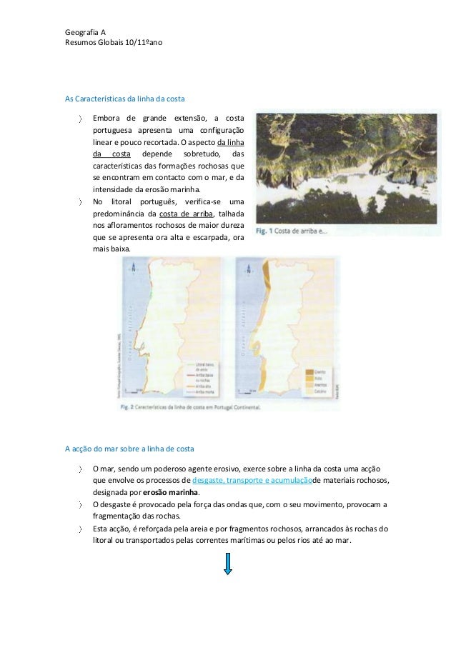 19. 19. Geografia AResumos Globais 10/11ºanoAs Características da linha da costaEmbora de grande extensão, a costaportuguesa apresenta uma configuraçãolinear e pouco recortada. O aspecto da linhada costa depende sobretudo, dascaracterísticas das formações rochosas quese encontram em contacto com o mar, e daintensidade da erosão marinha.No litoral português, verifica-se umapredominância da costa de arriba, talhadanos afloramentos rochosos de maior durezaque se apresenta ora alta e escarpada, oramais baixa.A acção do mar sobre a linha de costaO mar, sendo um poderoso agente erosivo, exerce sobre a linha da costa uma acçãoque envolve os processos de desgaste, transporte e acumulaçãode materiais rochosos,designada por erosão marinha.O desgaste é provocado pela força das ondas que, com o seu movimento, provocam afragmentação das rochas.Esta acção, é reforçada pela areia e por fragmentos rochosos, arrancados às rochas dolitoral ou transportados pelas correntes marítimas ou pelos rios até ao mar.