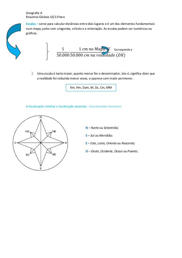 2. 2. Geografia AResumos Globais 10/11ºanoEscalas – serve para calcular distâncias entre dois lugares e é um dos elementos fundamentaisnum mapa, junto com a legenda, o título e a orientação. As escalas podem ser numéricas ougráficas.Uma escala é tanto maior, quanto menor for o denominador, isto é, significa dizer quea realidade foi reduzida menor vezes, e aparece com maior pormenor.A localização relativa e localização absoluta - Coordenadas terrestresCorresponde aKm, Hm, Dam, M, Dc, Cm, MMN – Norte ou Setentrião;S – Sul ou Meridião;E – Este, Leste, Oriente ou Nascente;O – Oeste, Ocidente, Ocaso ou Poente;