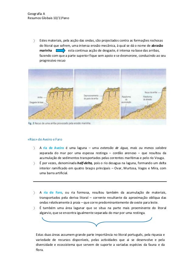 20. 20. Geografia AResumos Globais 10/11ºanoEstes materiais, pela acção das ondas, são projectados contra as formações rochosasdo litoral que sofrem, uma intensa erosão mecânica, à qual se dá o nome de abrasãomarinha esta continua acção de desgaste, é intensa na base das arribas,fazendo com que a parte superior fique sem apoio e se desmorone, conduzindo ao seuprogressivo recuo«Rias» de Aveiro e FaroA ria de Aveiro é uma laguna – uma extensão de água, mais ou menos salobraseparada do mar por uma espessa restinga – cordão arenoso – que resultou daacumulação de sedimentos transportados pelas correntes marítimas e pelo rio Vouga.É por vezes, denominada half-delta, pois o rio desagua na laguna, formando um deltainterior ramificado em quatro braços principais – Ovar, Murtosa, Vagos e Mira, comuma barra artificial.A ria de Faro, ou ria formosa, resultou também da acumulação de materiais,transportados pela deriva litoral – corrente resultante da aproximação oblíqua dasondas relativamente à praia – que corre predominantemente de oeste para leste.É também uma área lagunar que se situa na parte mais proeminente do litoralalgarvio, que se encontra igualmente separada do mar por uma restinga.Estas duas áreas assumem grande parte importância no litoral português, pela riqueza evariedade de recursos disponíveis, pelas actividades que ai se desenvolve e peladiversidade e ecossistema que servem de suporte a variadas espécies da fauna e daflora.