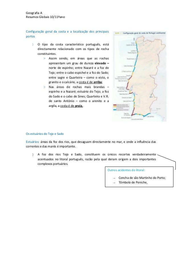 21. 21. Geografia AResumos Globais 10/11ºanoConfiguração geral da costa e a localização dos principaisportosO tipo da costa característico português, estádirectamente relacionado com os tipos de rochaconstituintes.> Assim sendo, em áreas que as rochasapresentam um grau de dureza elevado –norte de espinho; entre Nazaré e a foz doTejo; entre o cabo espichel e a foz do Sado;entre sagre e Quarteira – como o xisto, ogranito e o calcário, a costa é de arriba;> Nas áreas de rochas mais brandas –espinho e a Nazaré; estuário do Tejo; a fozdo Sado e o cabo de Sines; Quarteira e V.R.de santo António – como o arenito e aargila, a costa é de praia.Os estuários do Tejo e SadoEstuários: áreas da foz dos rios, que desaguam directamente no mar, e onde a influência dascorrentes e das marés é importante.A foz dos rios Tejo e Sado, constituem os únicos recortes verdadeiramenteacentuados no litoral português, razão pela qual deram origem a dois importantescomplexos portuários.Outros acidentes do litoral:→ Concha de são Martinho do Porto;→ Tômbolo de Peniche,