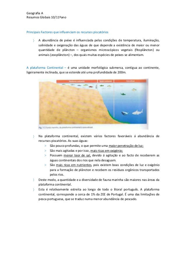 22. 22. Geografia AResumos Globais 10/11ºanoPrincipais Factores que influenciam os recursos piscatóriosA abundância de peixe é influenciada pelas condições de temperatura, iluminação,salinidade e oxigenação das águas de que depende a existência de maior ou menorquantidade de plâncton – organismos microscópicos vegetais (fitoplâncton) ouanimais (zooplâncton) –, dos quais muitas espécies de peixes se alimentam.A plataforma Continental – é uma unidade morfológica submersa, contígua ao continente,ligeiramente inclinada, que se estende até uma profundidade de 200m.Na plataforma continental, existem vários factores favoráveis á abundância derecursos piscatórios. As suas águas:> São pouco profundas, o que permite uma maior penetração de luz;> São mais agitadas e por isso, mais ricas em oxigénio;> Possuem menor teor de sal, devido á agitação e ao facto de receberem aságuas continentais dos rios que nela desaguam.> São mais ricas em nutrientes, pois existem boas condições de luz e oxigéniopara a formação de plâncton e recebem os resíduos orgânicos transportadospelos rios.Deste modo, a quantidade e a diversidade de fauna marinha são maiores nas áreas daplataforma continental.Esta é relativamente estreita ao longo de todo o litoral português. A plataformacontinental, corresponde a cerca de 1% da ZEE de Portugal. É uma das limitações depesca portuguesa, que se traduz numa menor abundância de pescado.
