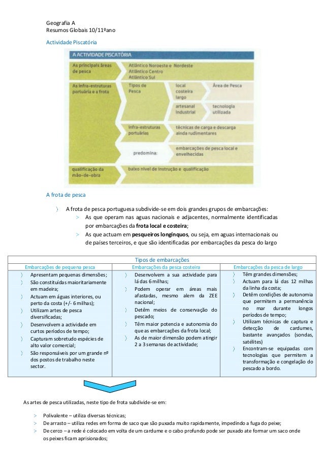 24. 24. Geografia AResumos Globais 10/11ºanoActividade PiscatóriaA frota de pescaA frota de pesca portuguesa subdivide-se em dois grandes grupos de embarcações:> As que operam nas aguas nacionais e adjacentes, normalmente identificadaspor embarcações da frota local e costeira;> As que actuam em pesqueiros longínquos, ou seja, em aguas internacionais oude países terceiros, e que são identificadas por embarcações da pesca do largoTipos de embarcaçõesEmbarcações de pequena pesca Embarcações da pesca costeira Embarcações da pesca de largoApresentam pequenas dimensões;São constituídas maioritariamenteem madeira;Actuam em águas interiores, ouperto da costa (+/- 6 milhas);Utilizam artes de pescadiversificadas;Desenvolvem a actividade emcurtos períodos de tempo;Capturam sobretudo espécies dealto valor comercial;São responsáveis por um grande nºdos postos de trabalho nestesector.Desenvolvem a sua actividade paralá das 6 milhas;Podem operar em áreas maisafastadas, mesmo alem da ZEEnacional;Detêm meios de conservação dopescado;Têm maior potencia e autonomia doque as embarcações da frota local;As de maior dimensão podem atingir2 a 3 semanas de actividade;Têm grandes dimensões;Actuam para lá das 12 milhasda linha da costa;Detêm condições de autonomiaque permitem a permanênciano mar durante longosperíodos de tempo;Utilizam técnicas de captura edetecção de cardumes,bastante avançados (sondas,satélites)Encontram-se equipadas comtecnologias que permitem atransformação e congelação dopescado a bordo.A rentabilização do litoral e dos recursos marítimosAs artes de pesca utilizadas, neste tipo de frota subdivide-se em:> Polivalente – utiliza diversas técnicas;> De arrasto – utiliza redes em forma de saco que são puxada muito rapidamente, impedindo a fuga do peixe;> De cerco – a rede é colocado em volta de um cardume e o cabo profundo pode ser puxado ate formar um saco ondeos peixes ficam aprisionados;