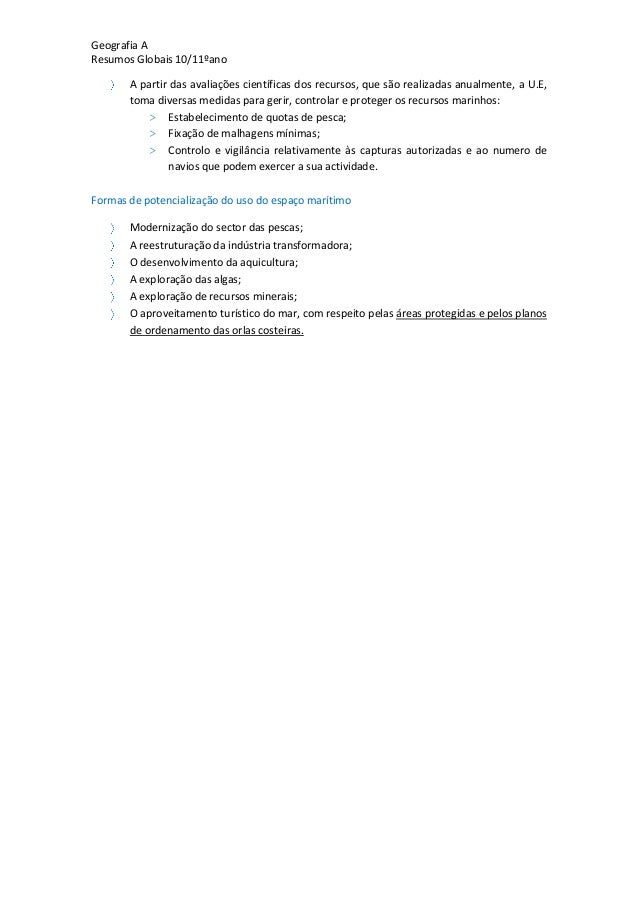 25. 25. Geografia AResumos Globais 10/11ºanoA partir das avaliações científicas dos recursos, que são realizadas anualmente, a U.E,toma diversas medidas para gerir, controlar e proteger os recursos marinhos:> Estabelecimento de quotas de pesca;> Fixação de malhagens mínimas;> Controlo e vigilância relativamente às capturas autorizadas e ao numero denavios que podem exercer a sua actividade.Formas de potencialização do uso do espaço marítimoModernização do sector das pescas;A reestruturação da indústria transformadora;O desenvolvimento da aquicultura;A exploração das algas;A exploração de recursos minerais;O aproveitamento turístico do mar, com respeito pelas áreas protegidas e pelos planosde ordenamento das orlas costeiras.