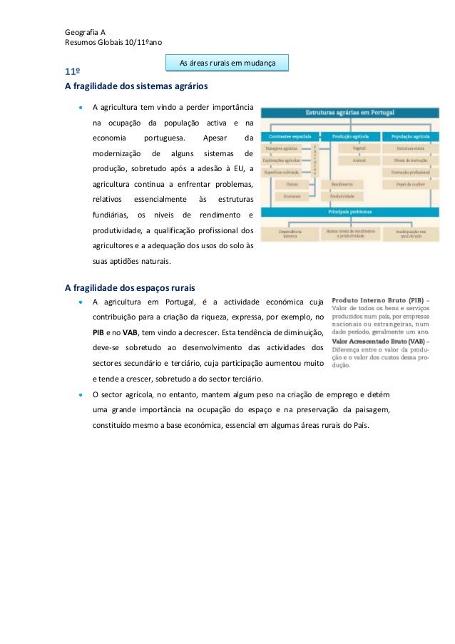 26. 26. Geografia AResumos Globais 10/11ºanoAs áreas rurais em mudança11ºA fragilidade dos sistemas agráriosA agricultura tem vindo a perder importânciana ocupação da população activa e naeconomia portuguesa. Apesar damodernização de alguns sistemas deprodução, sobretudo após a adesão à EU, aagricultura continua a enfrentar problemas,relativos essencialmente às estruturasfundiárias, os níveis de rendimento eprodutividade, a qualificação profissional dosagricultores e a adequação dos usos do solo àssuas aptidões naturais.A fragilidade dos espaços ruraisA agricultura em Portugal, é a actividade económica cujacontribuição para a criação da riqueza, expressa, por exemplo, noPIB e no VAB, tem vindo a decrescer. Esta tendência de diminuição,deve-se sobretudo ao desenvolvimento das actividades dossectores secundário e terciário, cuja participação aumentou muitoe tende a crescer, sobretudo a do sector terciário.O sector agrícola, no entanto, mantem algum peso na criação de emprego e detémuma grande importância na ocupação do espaço e na preservação da paisagem,constituído mesmo a base económica, essencial em algumas áreas rurais do País.