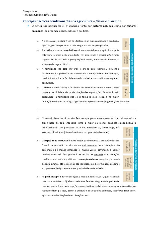27. 27. Geografia AResumos Globais 10/11ºanoPrincipais factores condicionantes da agricultura – físicos e humanosA agricultura portuguesa é influenciada, tanto por factores naturais, como por factoreshumanos (de ordem histórica, cultural e politica).o No nosso país, o clima é um dos factores que mais condiciona a produçãoagrícola, pela temperatura e pela irregularidade de precipitação.o A existência dos recursos hídricos é fundamental para a agricultura, poisesta torna-se mais fácil e abundante, nas áreas onde a precipitação é maisregular. Em locais onde a precipitação é menor, é necessário recorrer asistemas de rega artificial.o A fertilidade do solo (natural e criada pelo homem), influênciadirectamente a produção em quantidade e em qualidade. Em Portugal,predominam solos de fertilidade média ou baixa, um condicionante para aagricultura.o O relevo, quando plano, a fertilidade dos solos é geralmente maior, assimcomo a possibilidade de modernização das explorações. Se este é maisacidentado, a fertilidade dos solos torna-se mais fraca, e há maiorlimitação no uso da tecnologia agrícola e no aproveitamento/organização do espaço.o O passado histórico é um dos factores que permite compreender a actual ocupação eorganização do solo. Aspectos como a maior ou menor densidade populacional eacontecimentos ou processos históricos reflectem-se, ainda hoje, nasestruturas fundiárias (dimensão e forma das propriedades rurais).o O objectivo da produção é outro factor que influencia a ocupação do solo.Quando a produção se destina ao autoconsumo, as explorações sãogeralmente de menor dimensão e, muitas vezes, continuam a utilizartécnicas artesanais. Se a produção se destina ao mercado, as exploraçõestendem em ser maiores, utilizam tecnologia moderna (máquinas, sistemasde rega, estufas, etc) e são mais especializadas em determinados produtos– o que contribui para uma maior produtividade do trabalho.o As políticas agrícolas – orientações e medidas legislativas –, quer nacionaisquer comunitárias (U.E), são actualmente factores de grande importância,uma vez que influenciam as opções dos agricultores relativamente aos produtos cultivados,regulamentam práticas, como a utilização de produtos químicos, incentivos financeiros,apoiam a modernização das explorações, etc.