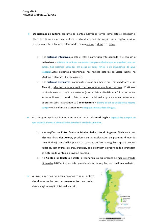 28. 28. Geografia AResumos Globais 10/11ºanoAs paisagens agrárias –espaço rural, sistema de culturas emorfologia agrária.O espaço rural ocupa uma parte significativa doterritório português e nele se desenvolvem asactividades agrícolas, mas também outras como oturismo, a produção de energias renováveis, etc.Dentro do espaço rural, destaca-se:o O espaço agrário – áreas ocupadas com a produçãoagrícola, pastagens e florestas, habitações dosagricultores e ainda infra-estruturas, eequipamentos associados à actividade agrícola;o O espaço agrícola – área utilizada para a produçãovegetal e/ou animal;o A superfície agrícola utilizada (SAU) – área doespaço agrícola ocupada com culturas.No espaço rural, as diferentes culturas, a forma e oarranjo dos campos, a malha dos caminhos e o tipode povoamento dão origem a diferentes paisagens agrárias.