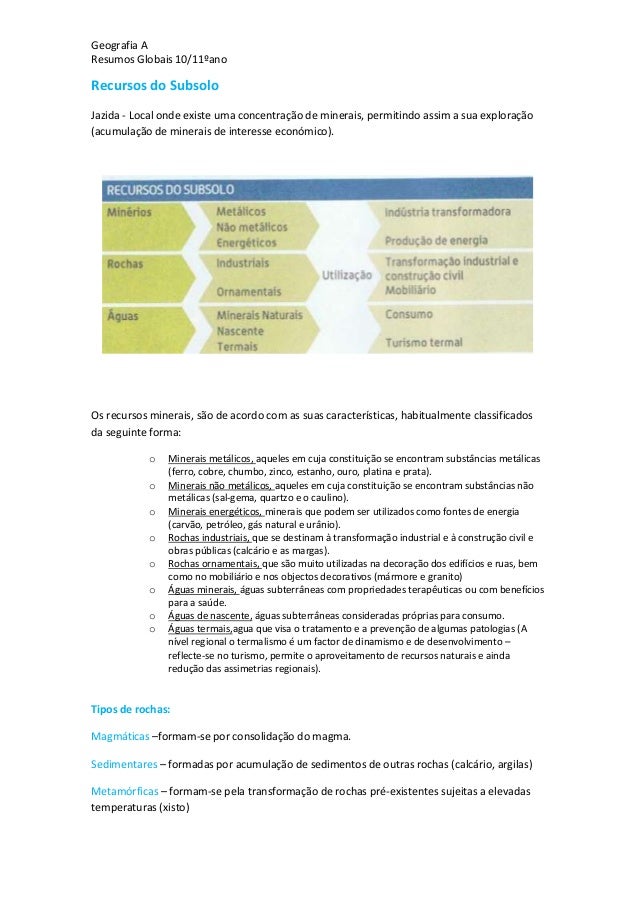 3. 3. Geografia AResumos Globais 10/11ºanoRecursos do SubsoloJazida - Local onde existe uma concentração de minerais, permitindo assim a sua exploração(acumulação de minerais de interesse económico).Os recursos minerais, são de acordo com as suas características, habitualmente classificadosda seguinte forma:o Minerais metálicos, aqueles em cuja constituição se encontram substâncias metálicas(ferro, cobre, chumbo, zinco, estanho, ouro, platina e prata).o Minerais não metálicos, aqueles em cuja constituição se encontram substâncias nãometálicas (sal-gema, quartzo e o caulino).o Minerais energéticos, minerais que podem ser utilizados como fontes de energia(carvão, petróleo, gás natural e urânio).o Rochas industriais, que se destinam à transformação industrial e à construção civil eobras públicas (calcário e as margas).o Rochas ornamentais, que são muito utilizadas na decoração dos edifícios e ruas, bemcomo no mobiliário e nos objectos decorativos (mármore e granito)o Águas minerais, águas subterrâneas com propriedades terapêuticas ou com benefíciospara a saúde.o Águas de nascente, águas subterrâneas consideradas próprias para consumo.o Águas termais,agua que visa o tratamento e a prevenção de algumas patologias (Anível regional o termalismo é um factor de dinamismo e de desenvolvimento –reflecte-se no turismo, permite o aproveitamento de recursos naturais e aindaredução das assimetrias regionais).Tipos de rochas:Magmáticas –formam-se por consolidação do magma.Sedimentares – formadas por acumulação de sedimentos de outras rochas (calcário, argilas)Metamórficas – formam-se pela transformação de rochas pré-existentes sujeitas a elevadastemperaturas (xisto)