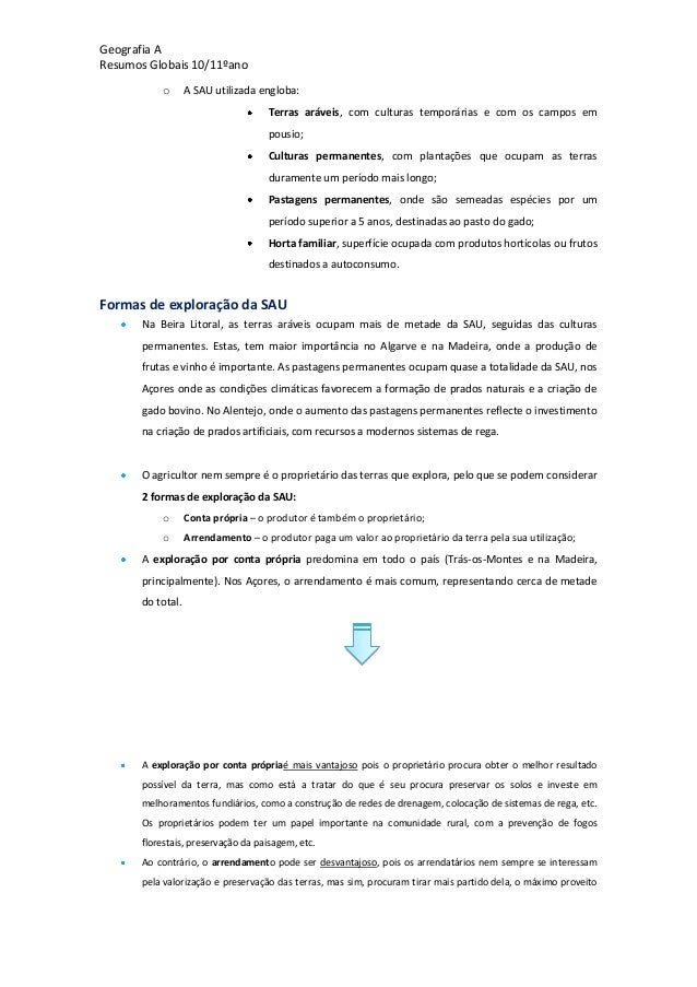 31. 31. Geografia AResumos Globais 10/11ºanoo A SAU utilizada engloba:Terras aráveis, com culturas temporárias e com os campos empousio;Culturas permanentes, com plantações que ocupam as terrasduramente um período mais longo;Pastagens permanentes, onde são semeadas espécies por umperíodo superior a 5 anos, destinadas ao pasto do gado;Horta familiar, superfície ocupada com produtos hortícolas ou frutosdestinados a autoconsumo.Formas de exploração da SAUNa Beira Litoral, as terras aráveis ocupam mais de metade da SAU, seguidas das culturaspermanentes. Estas, tem maior importância no Algarve e na Madeira, onde a produção defrutas e vinho é importante. As pastagens permanentes ocupam quase a totalidade da SAU, nosAçores onde as condições climáticas favorecem a formação de prados naturais e a criação degado bovino. No Alentejo, onde o aumento das pastagens permanentes reflecte o investimentona criação de prados artificiais, com recursos a modernos sistemas de rega.O agricultor nem sempre é o proprietário das terras que explora, pelo que se podem considerar2 formas de exploração da SAU:o Conta própria – o produtor é também o proprietário;o Arrendamento – o produtor paga um valor ao proprietário da terra pela sua utilização;A exploração por conta própria predomina em todo o país (Trás-os-Montes e na Madeira,principalmente). Nos Açores, o arrendamento é mais comum, representando cerca de metadedo total.A exploração por conta própriaé mais vantajoso pois o proprietário procura obter o melhor resultadopossível da terra, mas como está a tratar do que é seu procura preservar os solos e investe emmelhoramentos fundiários, como a construção de redes de drenagem, colocação de sistemas de rega, etc.Os proprietários podem ter um papel importante na comunidade rural, com a prevenção de fogosflorestais, preservação da paisagem, etc.Ao contrário, o arrendamento pode ser desvantajoso, pois os arrendatários nem sempre se interessampela valorização e preservação das terras, mas sim, procuram tirar mais partido dela, o máximo proveito